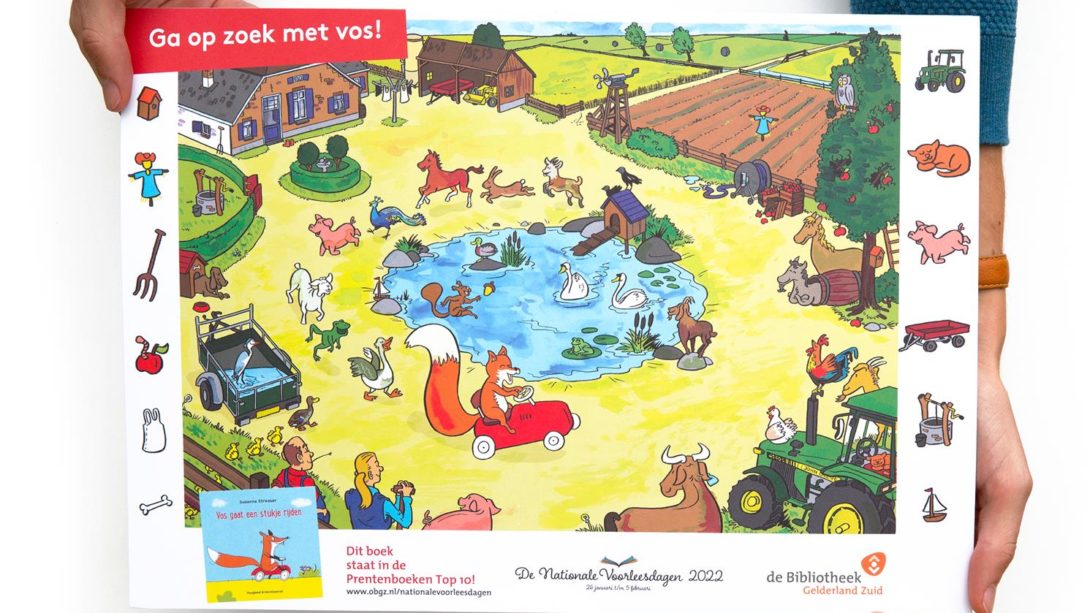 Zoekplaat ‘Ga op zoek met vos!’, met boerderijdieren. In het kader van De Nationale Voorleesdagen 2022, in opdracht van Bibliotheek Gelderland Zuid. Aansluitend bij het kinderboek Vos gaat een stukje rijden. Terug naar overzicht. Verzoekje voor een illustratie? Neem contact...